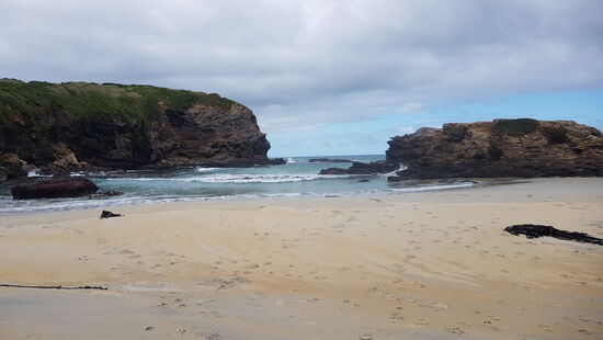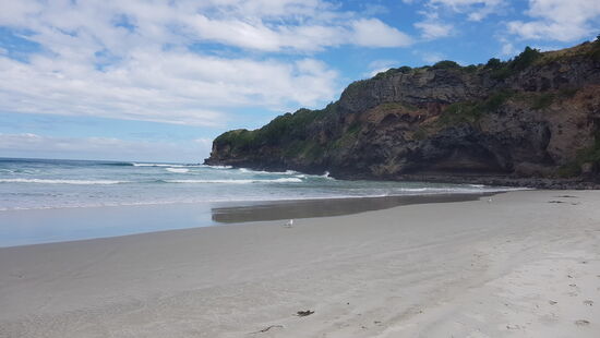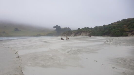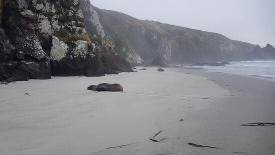 Am nächsten Tag sehe ich mir die abgelegenen Strände und Lagunen an der Ostküste der Otago-Halbinsel an. Zum Allen's Beach ist es nicht weit zu fahren. Vom Parkplatz ist es allerdings noch ein ganzes Stück bis zum Strand zu laufen. Zwei junge Seelöwen halten den Weg besetzt. Eigentlich soll man "möglichst" 10 m Abstand wahren, aber den beiden scheint der belebte Strandweg zu gefallen. Am Strand selber sind etliche erwachsene Exemplare bei der Siesta zu sehen. Am Südende tummelt sich eine ganze Gruppe, wobei die Männchen gerade lautstark Revierkämpfe veranstalten. Da bleibt man lieber auf Abstand. Das Wetter ist recht nebelig, deswegen hält sich auch die Zahl der Strandbesucher in Grenzen.