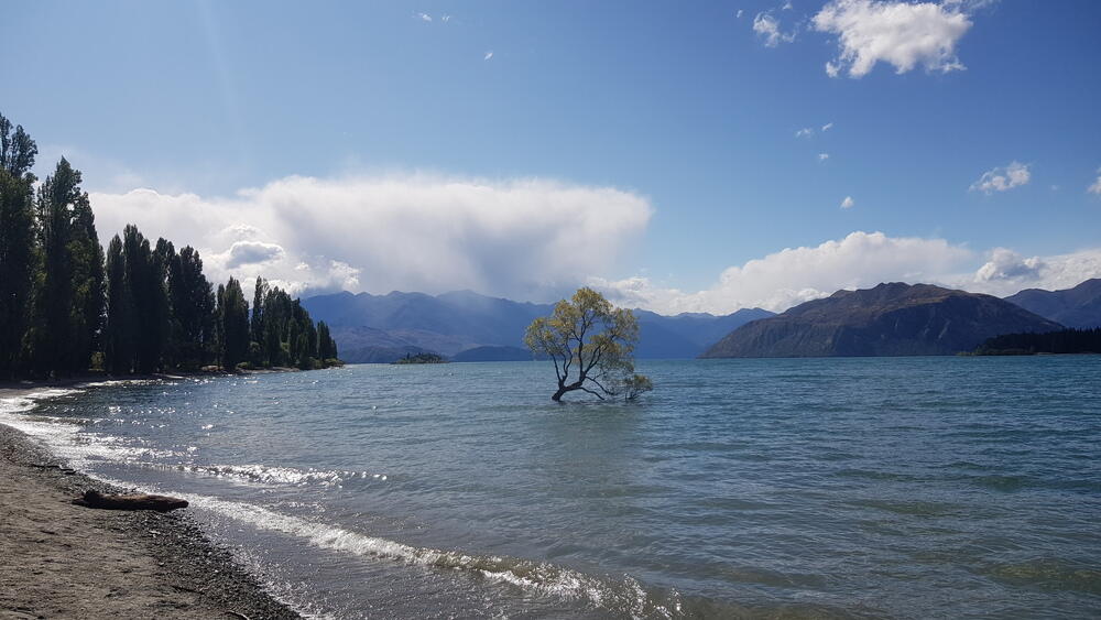 Am nächsten Morgen geht es zum Lake Hawea, etwa 20 Autominuten entfernt. Zunächst schaue ich mich beim Lake Hawea Holiday Park um. Schöner ist es aber am Scott's Beach. Von da aus unternehme ich eine Paddelrunde in östlicher Richtung. Zunächst ist es eher ruhig mit langen Wellen. Ein Strand mit schattenspendenden Bäumen bietet sich für eine Rast an. Bei der Rückkehr hat der Wind deutlich aufgefrischt und das Wasser ist unruhiger geworden. So lasse ich es für heute genug sein und packe alles zusammen.