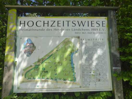 Von hier geht es bis Horbach, wo wir die erste Straße nach links nehmen. Wir befinden uns recht bald wieder in der Nähe von Haus Heyden, wo die Heimatfreunde des Heydener Ländchen eine Hochzeitwiese angelegt haben, auf der alle Bäume gestiftet wurden.