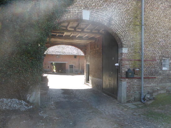 4-flügige Hofanlage in Backsteinmauerwerk Satteldächer, Herrenhaus 2 1/2-geschossig mit Krüppelwalm dach, 7 Achsen, seitl. zweiachsige Flügel - 1755 Schlussstein Toreinfahrt, 1788 Mauerwerksanker