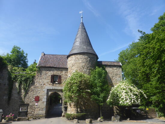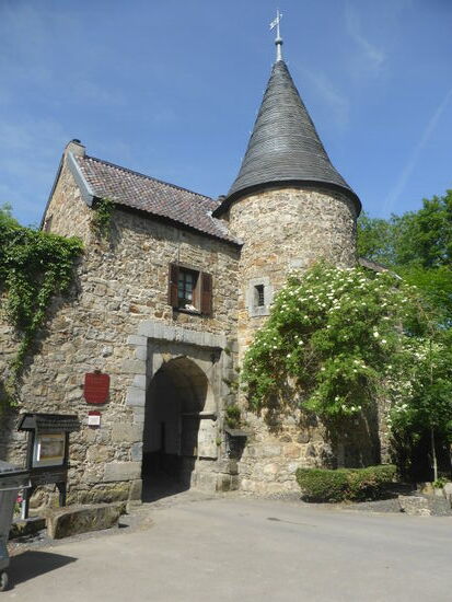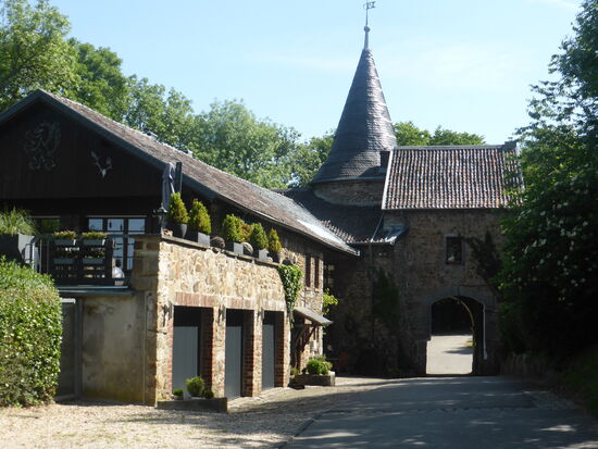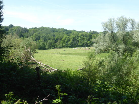 Von der Burg führt ein Pfad hinab zur Wurm - nach Überqueren derselben kann man durch das offene Wurmtal zwischen Wiesen und Waldrand zum Parkplatz zurücklaufen.