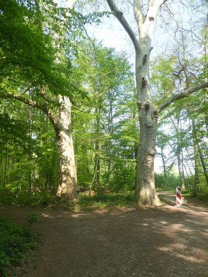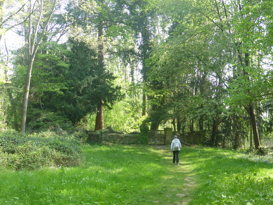 Vor dem Schloß stehend, wenden wir uns nach links und laufen den Weg in den Wald.