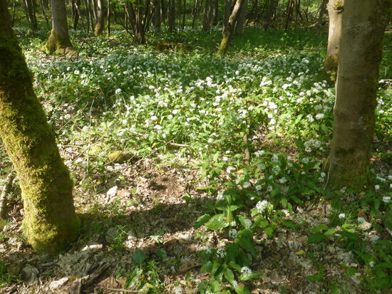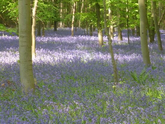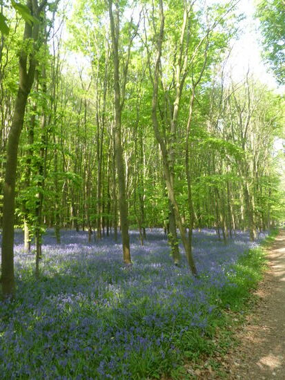 An einer Wegekreuzung beginnt das Naturschutzgebiet Kellenberger Kamp, in dem der Sibirischer Blaustern (Scilla siberica) den Waldboden in ein vollständiges Blau verwandelt.