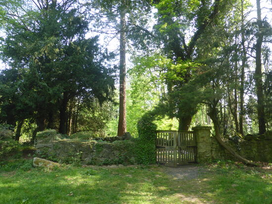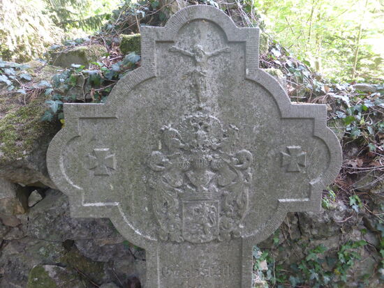 An einer Wegegabelung sehen wir altes Gemäuer. Wie sich herausstellt handelt es sich um einen alten privaten Friedhof der Familie der Reichsgrafen von und zu Hoensbroech.