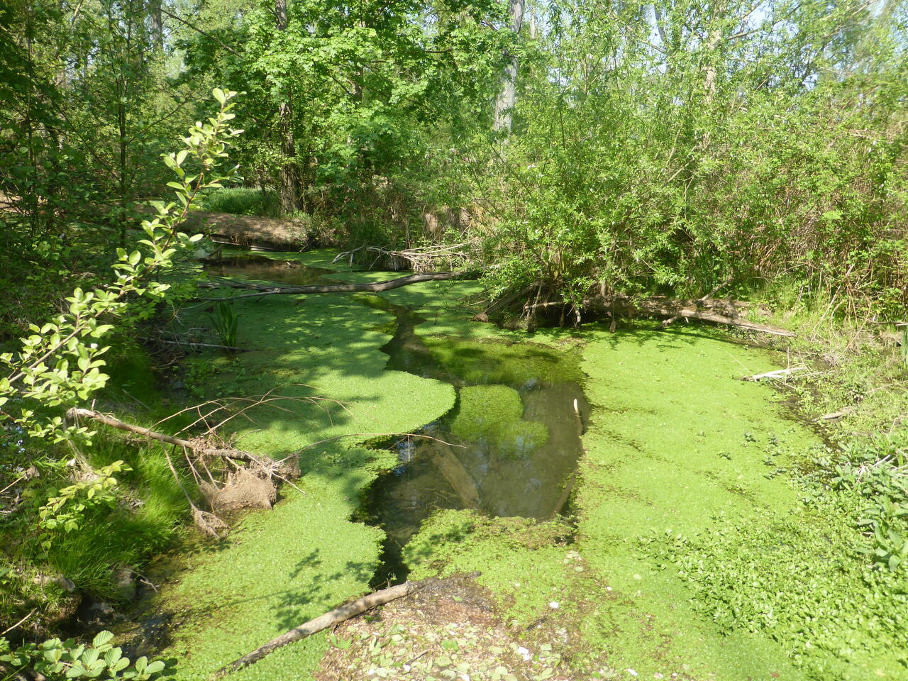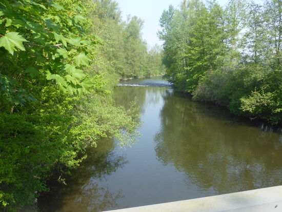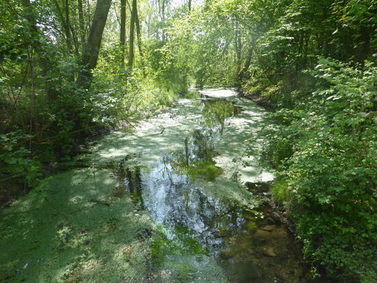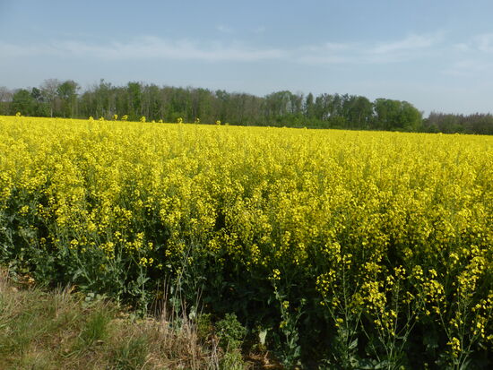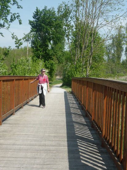 An einem Überschwemmungsgebiet vorbei geht es durch Felder, die herrlich in Gelb und Grün leuchten, vorbei am Pickartzhof, bis wir wieder die Möglichkeit haben, über eine Fußgängerbrücke zum Ausgangspunkt zurückzukehren.