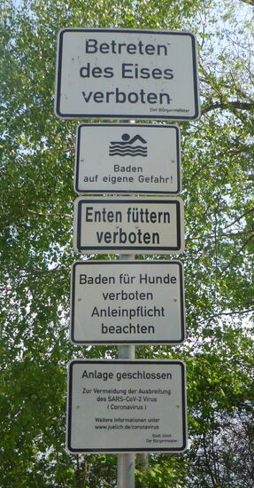 Aufgrund der Corona-Krise ist der Sandstrand mit Flatterband abgeriegelt, die Verbotsschilder haben sich daher auch 'vermehrt'