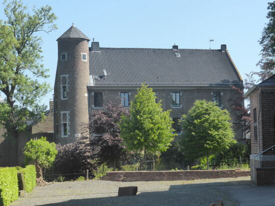 Das Herrenhaus ist ein Backsteinbau von 1841 auf rechteckigem Grundriss. Seine zwei Geschosse sind durch ein Satteldach abgeschlossen. Die spitzwinkeligen Giebel weisen an den Ortgänngen für den Niederrhein typische diagonal vermauerte Ziegel auf. Die Westecke des Gebäudes ist von einem schmalen, dreigeschossigen Rundturm mit flachem polygonalem Helm und Wetterfahne markiert. Er stammt noch von dem Vorgängerbau aus dem Jahr 1685 und besitzt Querstockfenster mit Hausteinfassung.[6] An der Ostecke schließt sich dem Gebäude ein schmaler Trakt an, der es mit einem zweigeschossigen Vierecksturm verbindet. Dass der Trakt wie der Rundturm noch von dem Vorgängerbau stammt, zeigt sich an den gleichartigen Fenstern.[6] Der viereckige Turm erhielt sein oberstes Geschoss samt flachem Pyramidendach erst 1841,[6] der untere Teil stammt hingegen aus dem 17. Jahrhundert.[/k]