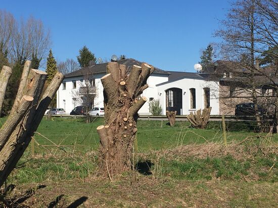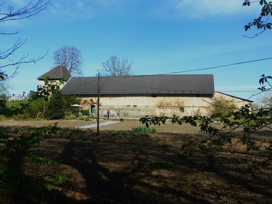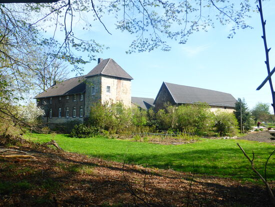 Wir gehen jedoch zurück und folgen dem Pfad an der Speckheuer Follmühle weiter - unterqueren die Schnellstraße, wo wir auf dem Kamm des Rückhaltebeckens für den 'wilden' Wildbach nach links weiterlaufen und schließlich Gut Hausen erreichen .