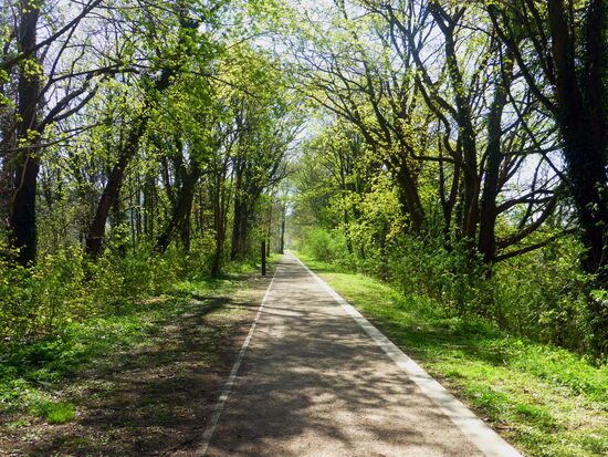 Am Ende des Weges hinter Gut Hausen kann man jedoch auf den Bahndamm hinaufsteigen und ihm Richtung Westen bis zur Schloßparkstraße folgen, wo er nochmals unterbrochen wurde.