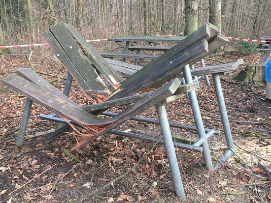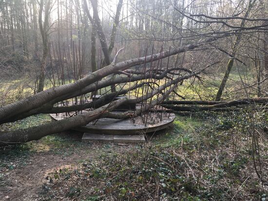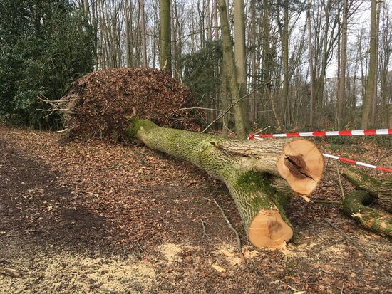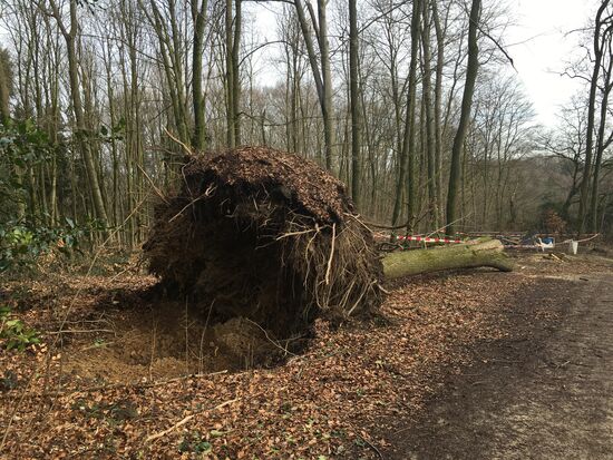 Geht man geradeaus so findet man ein Stück des alten Landgrabens als Hohlweg, der ins Tal der Wurm führt - wir aber biegen links in den kleinen Wald - das Paulinenwäldchen - ein, der aufgrund des letzten Sturm jedoch erheblich in MItleidenschaft gezogen wurde.