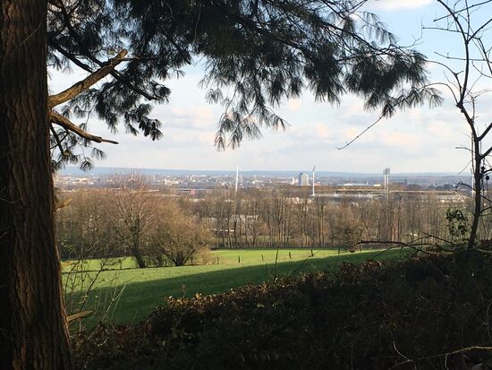 Der Weg führt nördlich der Autobahn den Berg hinauf - mit Blick auf die umfangreichen Anlagen der Kläranlage der Stadt Aachen. Ein erster markanter Punkt ist der am Ende des Weges am Rand des Aachener Talkessel stehende Obelisk.