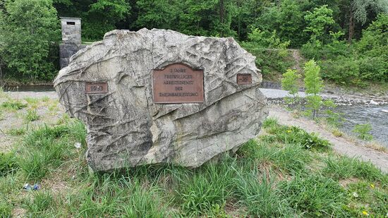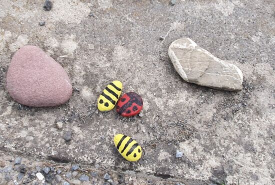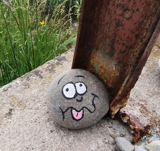 Bei der Brücke geh ich runter vom Damm und nun am Ratzbach entlang. Hier liegen viele bunt bemalte Steine, und eine Aufforderung Neue hin zu legen.
