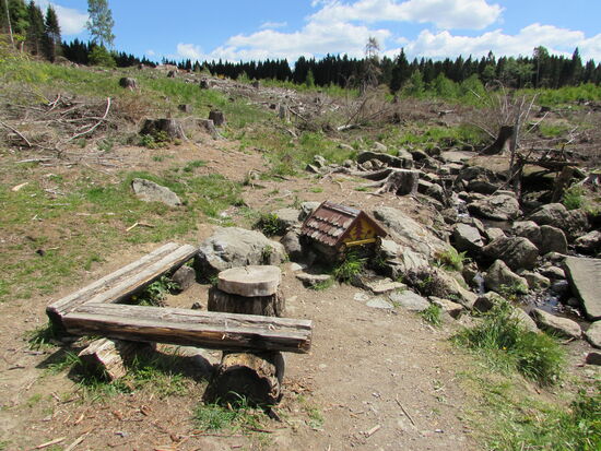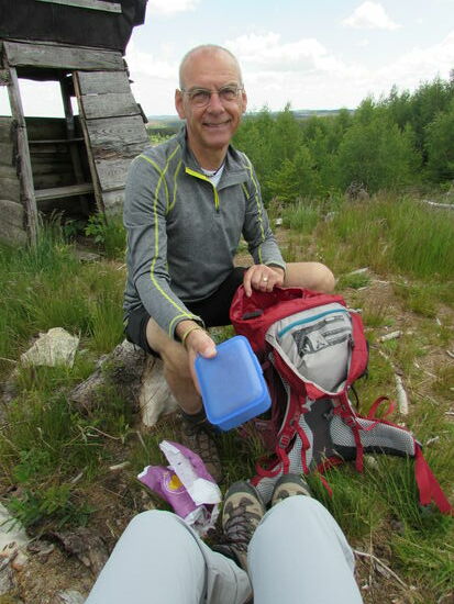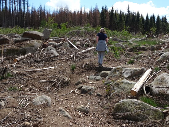 Nach wenigen Wanderminuten kommen wir auf eine kahlgeschlagene Anhöhe mit guter Fernsicht.
