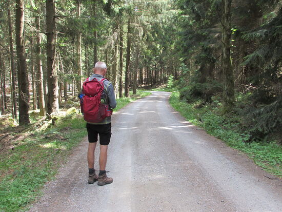 Durch trockenen Fichtenwald geht es Schritt für Schritt weiter.