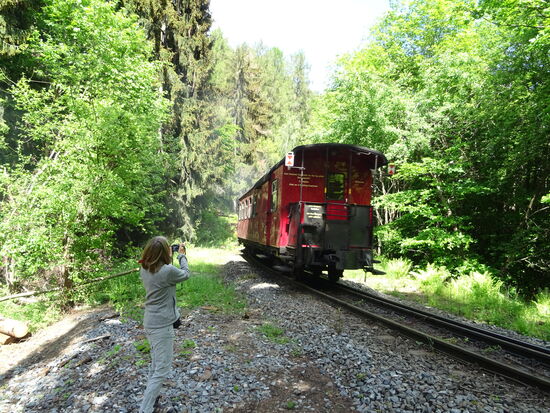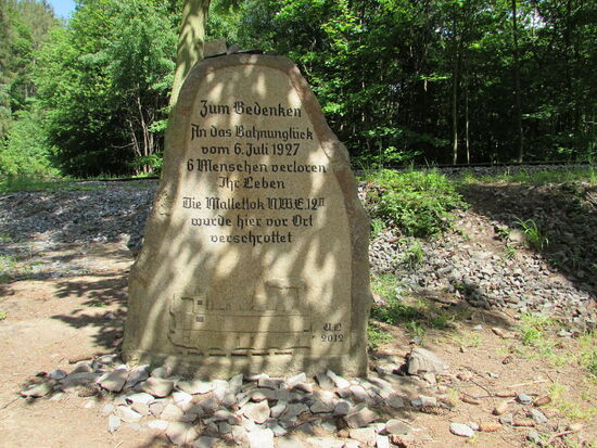 Wir haben Glück, gerade sind wir am Gedenkstein angekommen, hören wir das Getöse der historischen Lokomotive