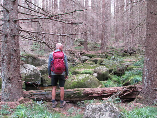 Die Wanderung führt nun wieder durch einen Abschnitt abgestorbener Fichten. Der Borkenkäfer und zwei trockene Sommer waren zuviel für die Bäume.