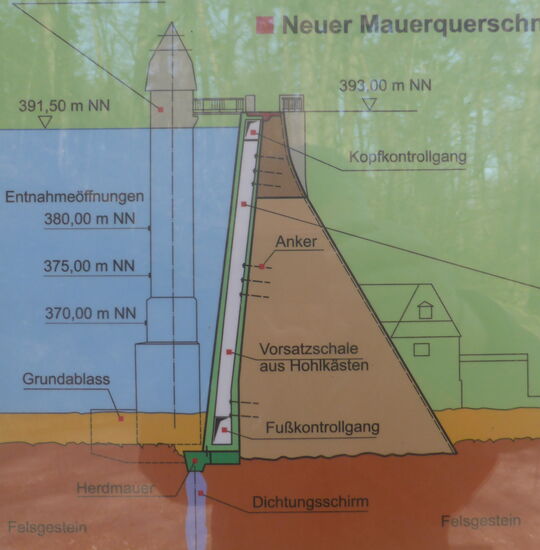 Bei den Arbeiten wurde die historische Bausubstanz weitgehend erhalten. Einige Bestandteile des alten Staumauerbauwerks wie Kronenhaus, Entnahmeturm und die Dammkrone aus Naturstein mussten jedoch rückgebaut werden.
