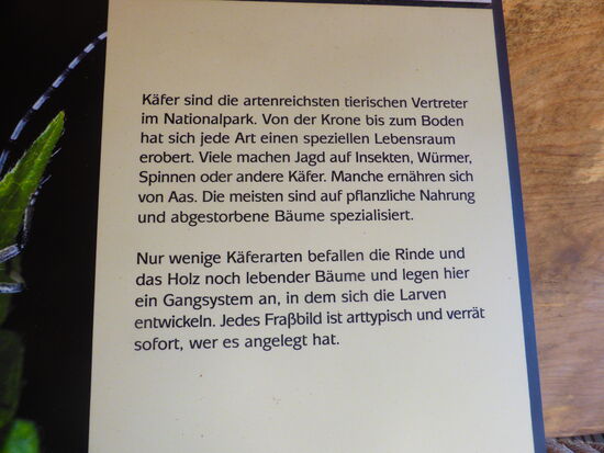 Käfer sind die artenreichsten tierischen Vertreter im Nationalpark. Von der Krone bis zum Boden hat sich jede Art einen speziellen Lebensraum erobert. Viele machen Jagd auf Insekten, Würmer, Spinnen oder andere Käfer. Manche ernähren sich von Aas. Die meisten sind auf pflanzliche Nahrung und abgestorbene Bäume spezialisiert.