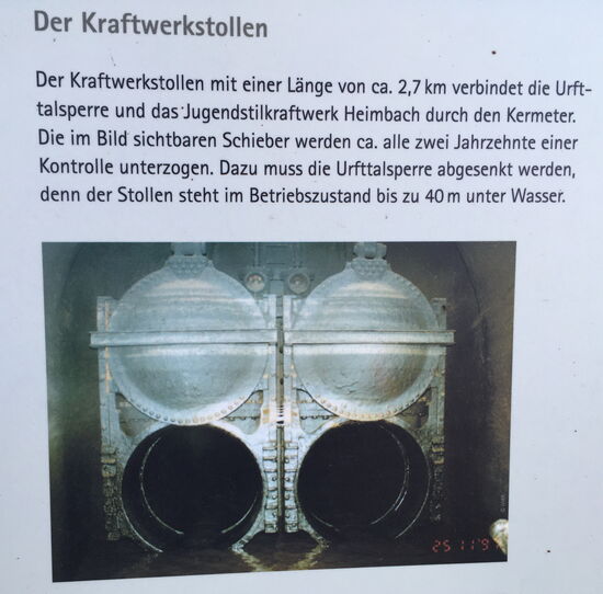 Der Grund der Absenkung ist, dass der sogenannte Kermeter-Stollen, mit dem das Wasser der Urfttalsperre den Höhenrücken (Kermeter) hindurch zum Jugendstilkraftwerk in Hasenfeld fließt, kontrolliert und begangen werden muß.. Die letzte Inspektion war im Jahr 1997 geschehen - der Prüfrhythmus ist etwa 20 Jahre.