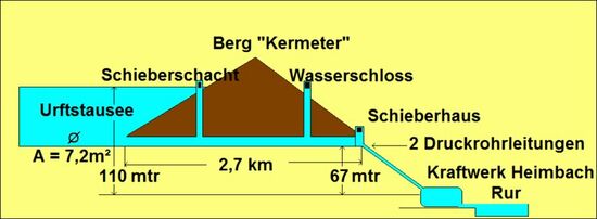 Der Kermeterstollen steht unter einem ständigen Wasserdruck, der von der Stauhöhe in der Urfttalsperre abhängig ist. Da der Kermeterstollen eine 28 km lange Flussschleife abkürzt, beträgt die Fallhöhe zum Kraftwerk bei maximaler Stauhöhe der Talsperre 110 m, was für ein Mittelgebirge ein ungewöhnlich hoher Wert ist. Vor dem Austritt des Kermeterstollens oberhalb des Kraftwerks Heimbach in die Druckrohre wird in einem Wasserschloss der schwankende Wasserbedarf der Wasserturbinen ausgeglichen. Außerdem vermindert das Wasserschloss den Druckstoß, der beim Schließen von Armaturen in der Druckrohrleitung entsteht. Das Wasserschloss ist, wie aus dem Schnittbild ersichtlich, ein senkrechter Schacht, der bis zum Stollen hinab führt.