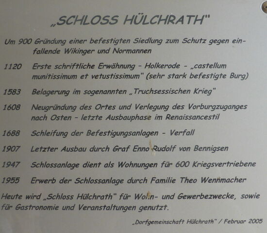 Die Geschichte der Anlage verdeutlicht sehr gut die typische Entwicklung eines Adelssitzes im Rheinland: Durch kontinuierliches Wachstum veränderte sich eine hölzerne Motte über eine zweiteilige Wasserburg in der Renaissance zu einer Schlossanlage, die nach Zerstörung im 17. Jahrhundert am Anfang des 20. Jahrhunderts im Stil der Neugotik wiederaufgebaut wurde. Im Mittelalter war die Hülchrather Anlage eine der bedeutendsten Landesburgen des Kölner Territoriums.
