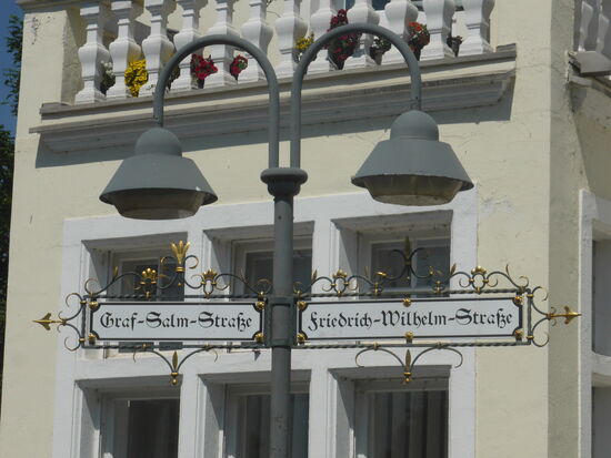 Zunächst fallen uns die auf 'alt' getrimmten Straßenschilder auf, als wir vom Parkplatz zum Schloß laufen.