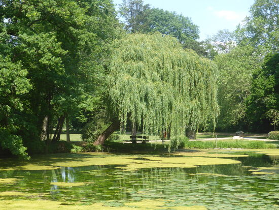 Dabei hat der renommierte Planer Maximilian von Weyhe mit seinen Ideen zur Umgestaltung des Parks entscheidend beigetragen. Ausgedehnte Wasserflächen und zahlreiche markante Einzelbäume, unter ihnen alte Mammutbäume, Gingkos und Riesenlebensbäume, prägen das Bild.