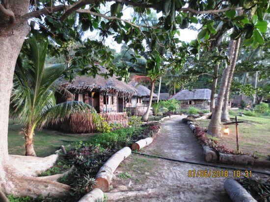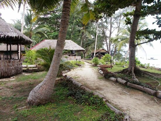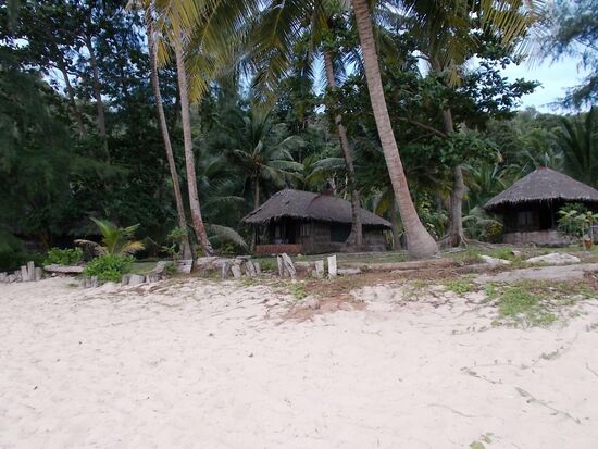 Hinter dem Sandstrand verstecken sich die Gästebungalows zwischen Palmen und üppig grüner Vegetation. Die Wirtschaftsgebäude dahinter sind kaum zu sehen.