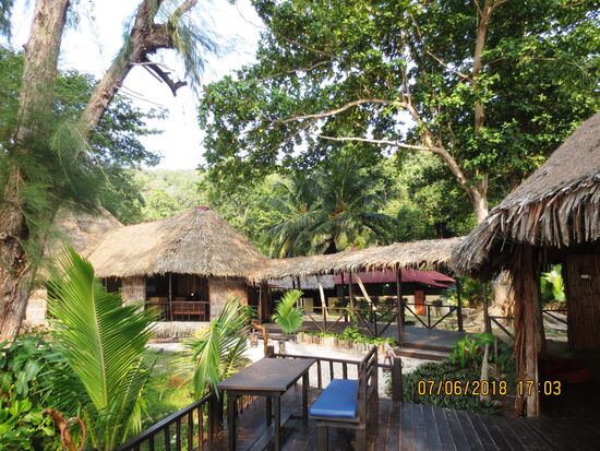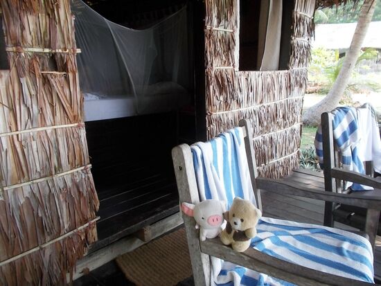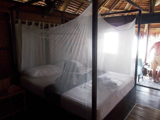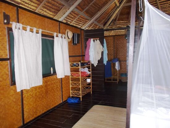 Die offenen Bungalows für die Gäste sind aus Holz und Palmwedeln gebaut, trotzdem sehr komfortabel ausgestattet mit Ventilatoren, dezenter Beleuchtung, einem geräumigen Badezimmer mit Toilette und Warmwasserdusche. Die bequemen Betten sind durch ein Moskitonetz geschützt.