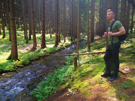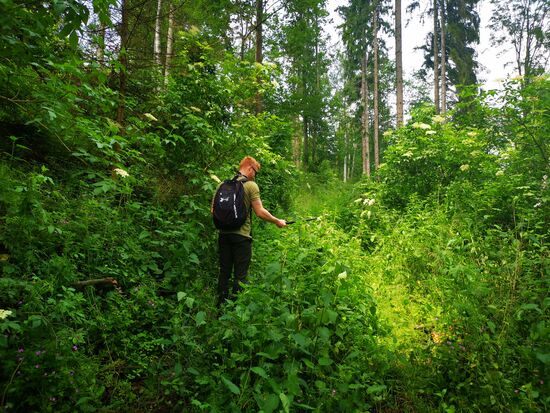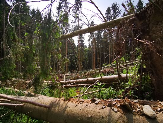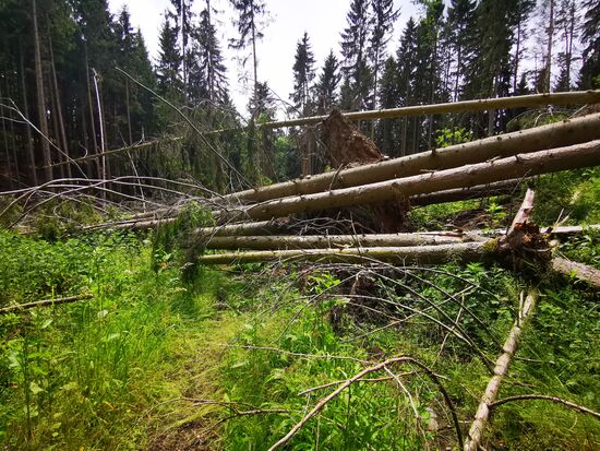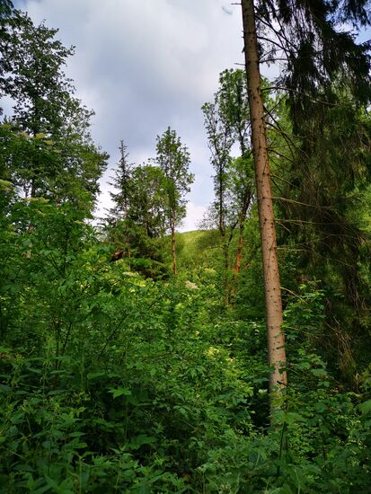 Es geht wieder hinab - durch ein Waldstück. Gräser und Brennesseln sind bis in Brusthöhe gewachsen und der Weg lässt sich nur noch erahnen. Tim ist nicht wirklich erfreut und verweist mich auf das Risiko sich hier ein paar Zecken einzufangen, folgt mir aber... noch ... bis dann jäh nicht Brennesseln und Zecken, sondern umgestürzte Bäume unseren Weg beenden: der Wald sieht aus, als habe ein Riese mit den Bäumen Mikado gespielt und ein weiteres vorwärts Kommen gestaltet sich als "mission impossible" - 300 m vor dem angezeigten Ziel auf google maps!!