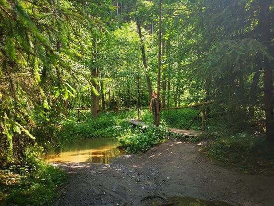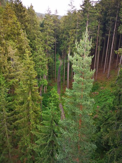 Auto parken. Hier finden wir einen normal begehbaren Forstweg und endlich, nach ca. 2 km Fußweg stehen wir mitten im Wald direkt am Fuß des Viadukts!