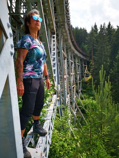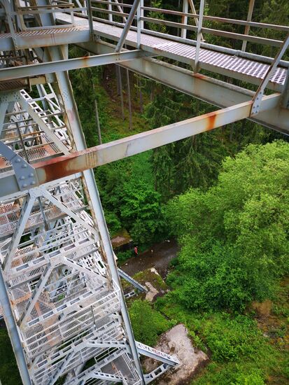Kein Mensch weit und breit und nun haben Mutter und Sohn gleichermaßen Freude am Klettern, fotografieren und staunen. Und so startet nach dem "Urwald-Workout" das "Brücken-Workout". Tim gönnt sich einige Klimmzüge mit Aussicht und ich starte Höhenangstbewältigungs-Klettern