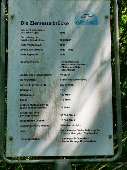 Die Ziemestalbrücke ist ein 115 Meter langer und 32 Meter hoher Viadukt der Bahnstrecke Triptis–Marxgrün in Thüringen, der zwischen 1893 und 1895 erbaut wurde. Sie führt auf fünf Gerüstpfeilern (engl. trestles) in leichtem Bogen über den Ziemesgrund zwischen Ziegenrück, Altenbeuthen und Remptendorf. Amtlich gehört der Viadukt zur Gemeinde Remptendorf. Er ist eingleisig und besteht vollständig aus Stahl. Die Brücke verläuft in einer Kurve mit einem Radius von 193 m und mit einem Gefälle von 2 %. Um höhere Geschwindigkeiten zu erreichen ist der Brückenkopf geneigt. (Quelle: Wikipedia)