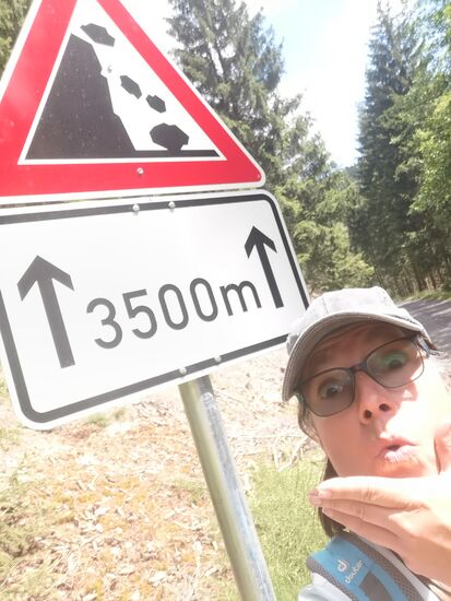 Am meisten belastet mich allerdings der Bodenbelag. Die Strecke ist ein alter Asphaltweg, von Schotter durchsetzt. Und im Laufe der Kilometer merke ich dann doch die Füße und Knie.... Allerdings entschädigt die Aussicht und die Natur rechts und links des Weges.
