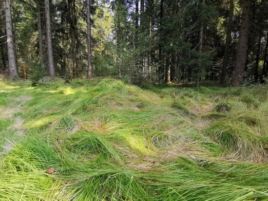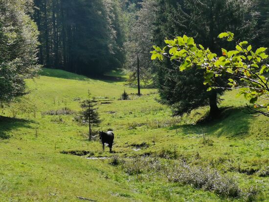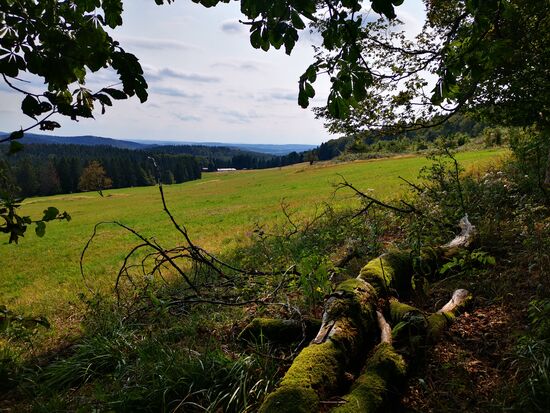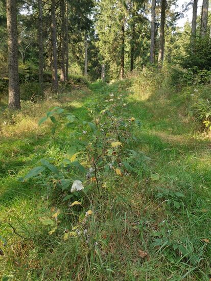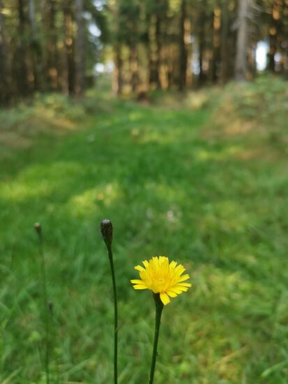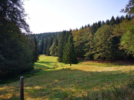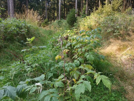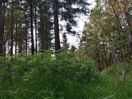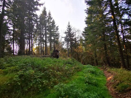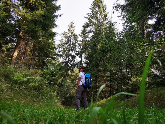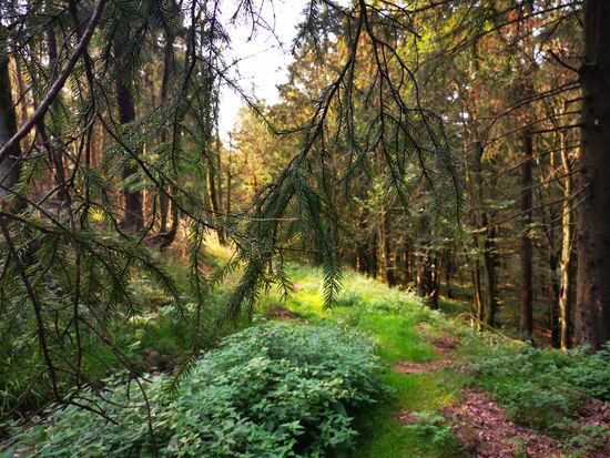 Nach dem Waldgasthaus Schwarzer Crux freue ich mich über federnden Waldboden mit viel Gras.