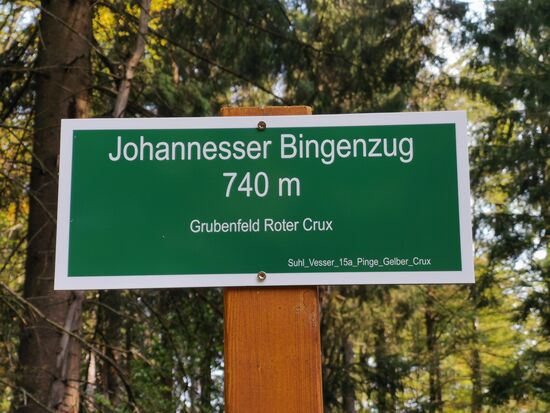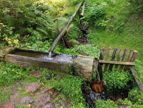 Nach kurzer Zeit gelange ich zur Vesser-Quelle. Ein Wanderer macht mich darauf aufmerksam, dass das Wasser hier eigentlich aus drei Quellen kommt. "Aha, sage ich, dann macht das Hinweisschild ja Sinn, da es in einer Astgabel mit 3 Ästen befestigt ist." Der Wanderer denkt nicht, dass dies ein gewollter Zusammenhang ist, bescheinigt mir jedoch eine blühende Fantasie.