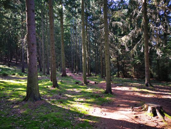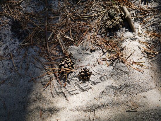 Der Weg verläuft zunächst im Wald. Der Boden ist sandig, übersät mit Kiefernzapfen und -nadeln, fast ein wenig wie in manchen Gegenden am Mittelmeer.