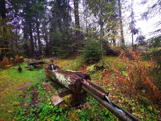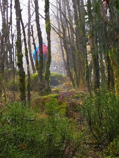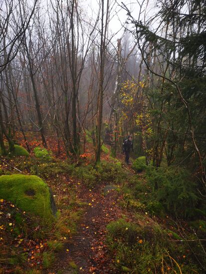 Wir wählen nicht den direkten Weg, es ist ja noch früh (10 Uhr), sondern die etwas längere Variante. Wie so oft hier im Thüringer Wald wechseln bequeme Wald-/Forstwege mit kleinen Pfaden, die voll von Wurzeln sind, Baumstämme, Steine alles dicht bemoost. Es sind wildromantische Eindrücke und nachdem wir uns damit abgefunden haben, dass wir die Sonne heute wohl nicht sehen werden, fangen wir an, Gefallen an dem nebeligen Wetter zu finden - immerhin ist ja Halloween, ein wenig "spooky" darf es da schon sein. Und: in Thüringen ist Feiertag und bei gutem Wetter wären uns bestimmt viel mehr Menschen begegnet. Also freuen wir uns, dass uns die Menschen nur in der Nähe von Wirtschaften begegnen