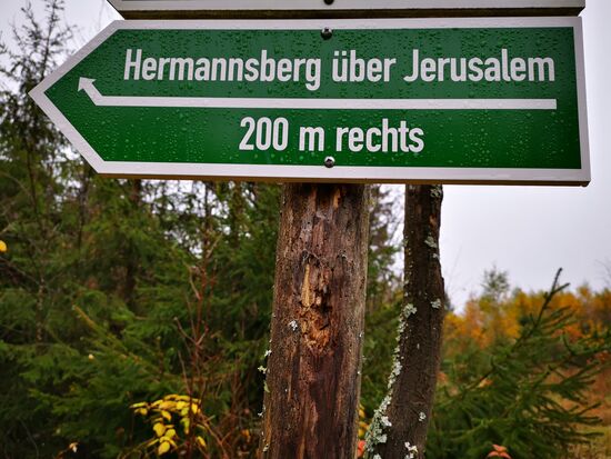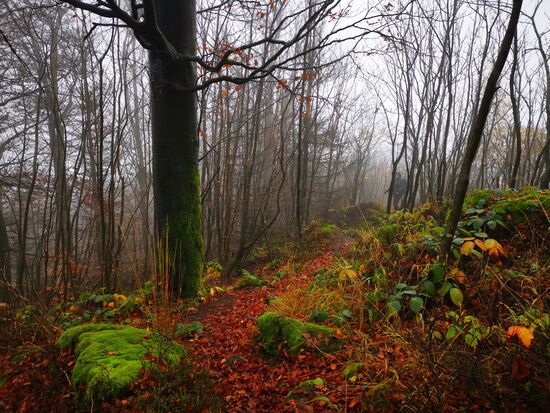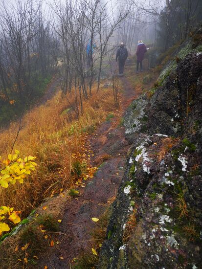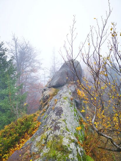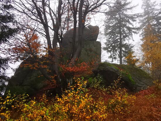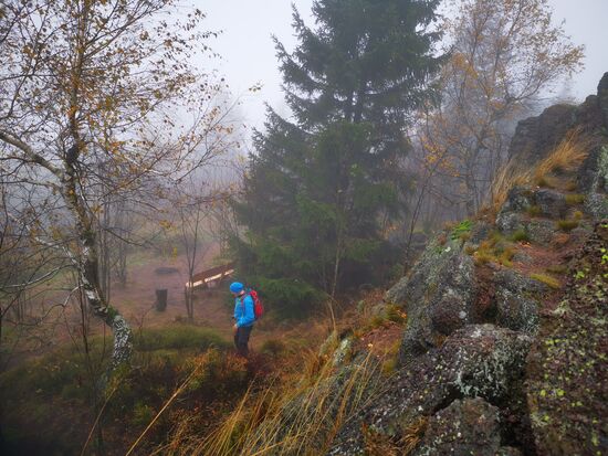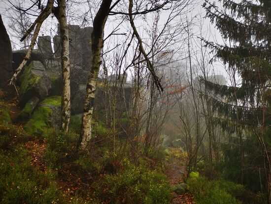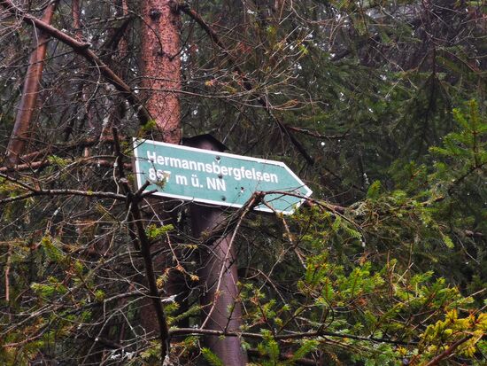 Es geht zunächst wieder bergab, dann aber wieder hinauf - kein Wunder, immerhin wollen wir ja erneut auf einen Berg, auch wenn wir die Sache mit der schönen Aussicht bereits aufgegeben haben. Wir erreichen den Hermannsfelsen und dann auch noch den Gipfel des Großen Hermannsberg. Da wir jedoch weiterhin nur Nebel sehen, füge ich hier eine Beschreibung aus dem Internet ein: