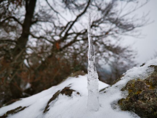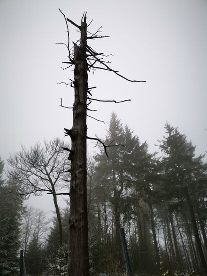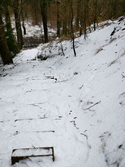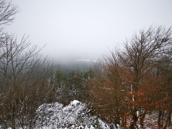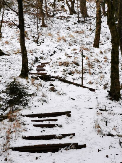 Das Wetter gestaltet sich grau und nebelig, aber die Waldwege sind noch schneebedeckt, zum Glück griffig und nicht matschig und ich genieße es, seit langer Zeit mal wieder, dieses typische Knirschen unter den Schuhen zu hören, wenn man über Schnee läuft.