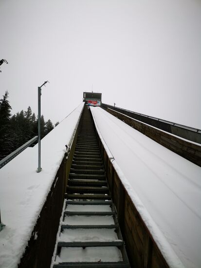 Ich weiß nicht, wie viele Treppen neben den Schanzen ich rauf (und später wieder runter laufe), um die verschiedenen Ausblicke zu sehen und mal ein Gefühl dafür zu bekommen, wie es sich an so einem Startpunkt für Skispringer anfühlt.