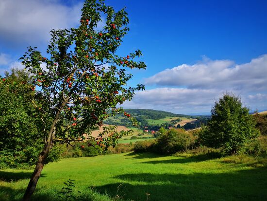 609 Aufstiegs-Höhenmeter - da läuft der Schweiß in Bächlein, aber die Aussicht entschädigt und eine Holunderschorle und ein Stück Pflaumenkuchen im Bergstübchen - bzw. bei herrlichem Sonnenschein DAVOR - sorgen für Regeneration.