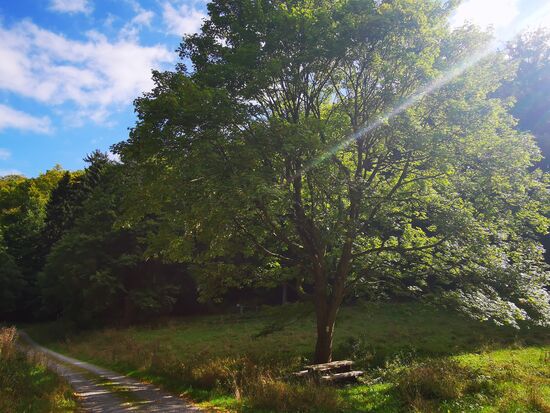 Ich befinde mich in der Nähe des Reit- und Ferienpark Dörrensolz. Man merkt es anhand der vielen tiefen Hufspuren, die im weichen Waldboden zu sehen sind. Inzwischen führt der Rundweg nämlich durch Waldgebiet.