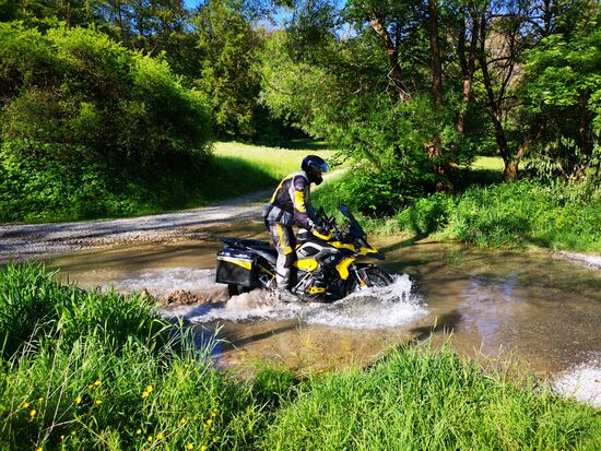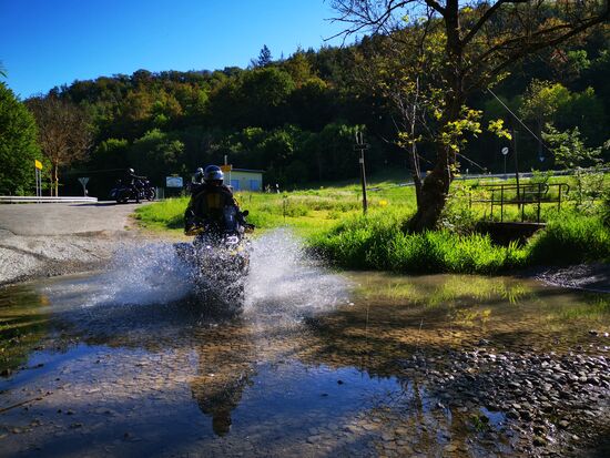 Kurz nach dem Start entdeckt Michael eine Pfütze, die für die ersten BMW-offroad-Fotos herhalten muss. Zum Glück kann ich VORHER noch ein wunderschönes Bild von dem klaren Wasser und der Spiegelung machen. Zurück gelassen wird ein trübe Brühe