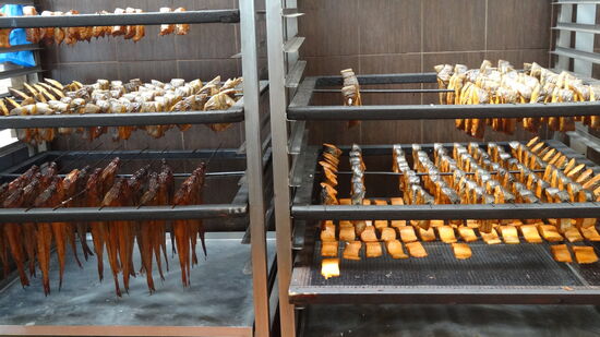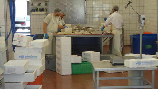 Ein ganzes Stück in die andere Richtung, kann man durch Scheiben beim zuschneiden und verpacken des Frischfisches in einer Fischhalle zusehen