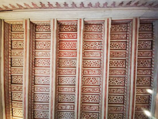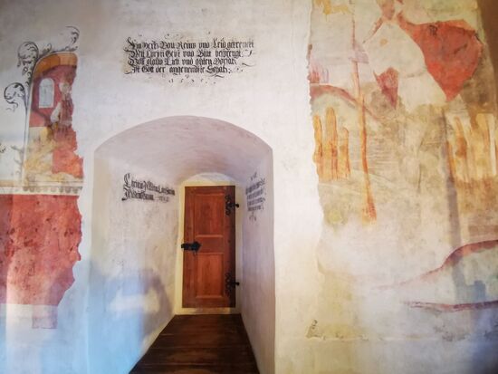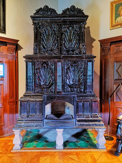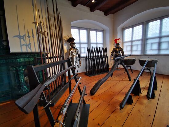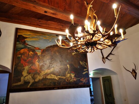 Wetterfahne mit Knauf, 1736, ursprünglich auf dem Dachreiter des Wohnturms bis 1911 eine Neuanfertigung in Kupfer gemacht wurde.