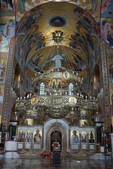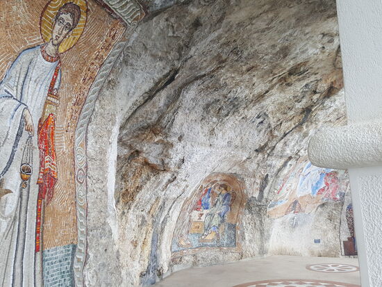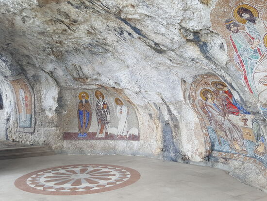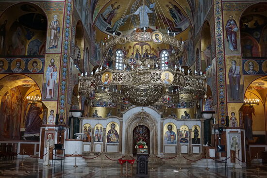 Da hinten ist der Eingang zur Grabstelle vom Erzbischof Vasilija, der verstarb und exhumiert wurde. Jetzt liegt er tatsächlich hier in der geschmückten Höhle.