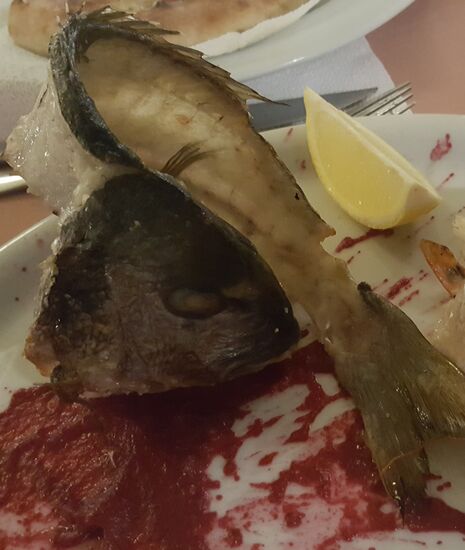 Hier etwas näher: der Fisch ist filetiert, und das „Gerüst“ nett drapiert—sieht man auf dem Bild schlecht. In die beiden Filets wurden Scampi eingewickelt