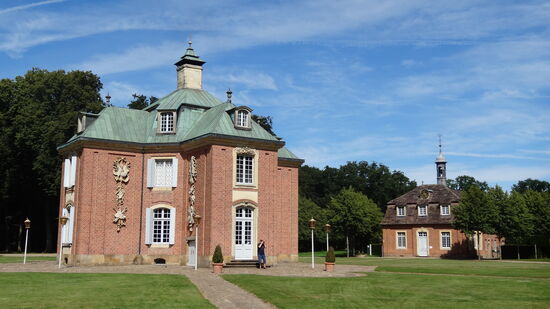 Um 11 Uhr waren wir dort, geänderte Öffnungszeiten. Vor der Führung wurde im Pavillon "Paderborn" ein kurzer Film über die Anlage gezeigt, darin ist auch ein kleines Museum, rückseitig eine Latrine, für diese Zeit aussergewöhnlich. Auch die Besichtigung des eigentlichen Jagdschlosses im Zentrum erwies sich als recht kurz, die obere Etage mit Privaträumen nicht zugänglich, da dort die Abstandsregelungen nicht eingehalten werden können. Der Hauptraum Parterre war vorbereitet für eine Trauung, die am heutigen Nachmittag stattfinden sollte.