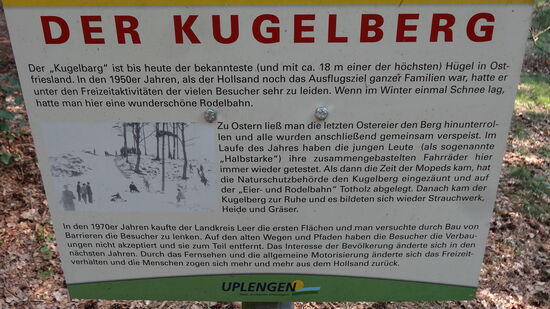Auch die höchste natürliche Erhebung Ostfrieslands befindet sich mit dem "Kugelberg" von 18,6 m Höhe dort. 18,6 m hoch, man glaubt es kaum, können wir, eigentlich aus Nordhessen stammend, nur leicht schmunzeln, die "Kasseler Berge" dürften vielen Autofahrern bekannt sein.